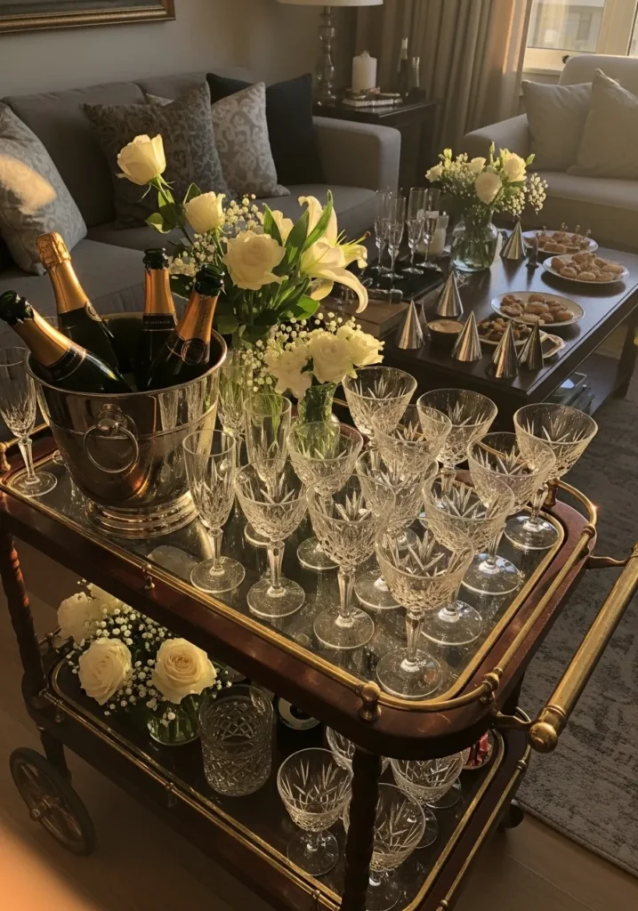 I am such a fan of bar carts at parties. They feel classic and a little indulgent. This one adds elegance while keeping things light and social.