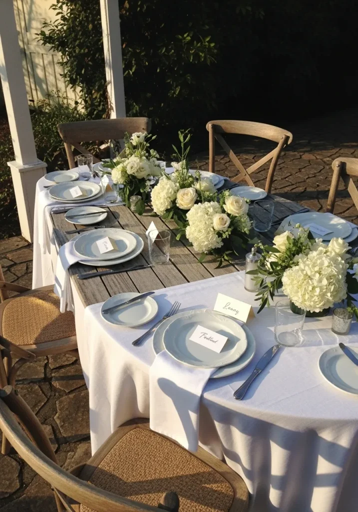 This outdoor table uses crisp linens, subtle blue details, and fresh white flowers to create a serene look. The chairs and tableware stay simple, letting the colors and natural light do most of the work.