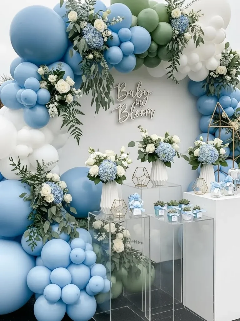 This setup feels like a breath of fresh air the moment you look at it. The layered balloon arch blends soft powder blue with muted sage green and creamy white for a look that feels modern but still sweet. The balloons vary in size which keeps everything looking organic and styled rather than stiff. I love how the florals are tucked right into the arch with white roses eucalyptus and pale blue blooms adding that Baby in Bloom charm without feeling overdone. Clear acrylic pedestals keep the space light and airy while letting the details shine from the florals to the tiny favors lined up so neatly.