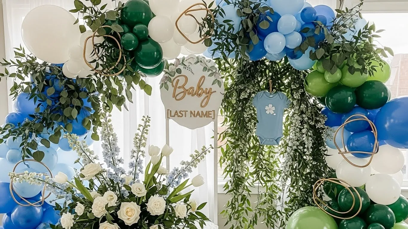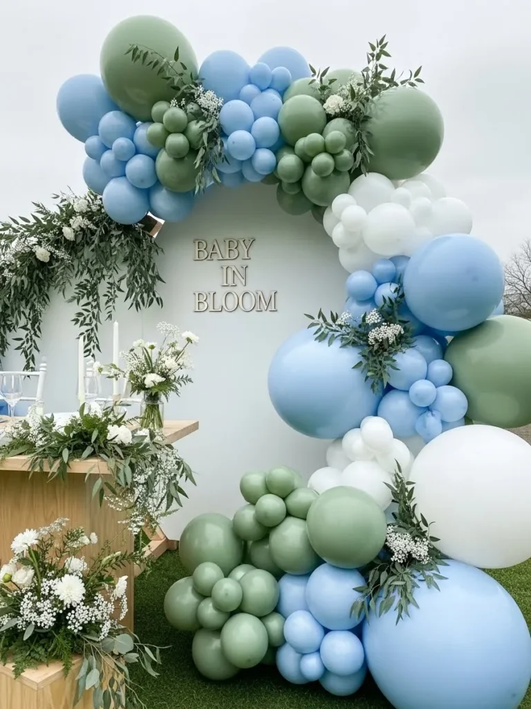 This setup features a clean modern backdrop paired with an oversized balloon arch in soft blue sage green and creamy white tones. The balloons are styled in mixed sizes to create that full organic look everyone loves right now. Fresh greenery and delicate white florals are tucked throughout the arch which gives it that Baby in Bloom feeling without looking overly themed. The neutral base keeps everything calm and airy while the natural textures from the leaves and wood table add warmth and balance. It feels polished but still relaxed which is such a sweet combo for a modern baby shower at home or outdoors.