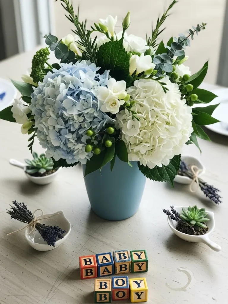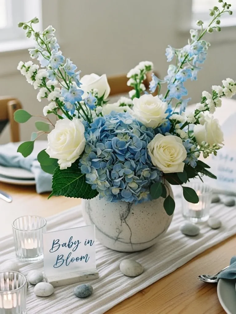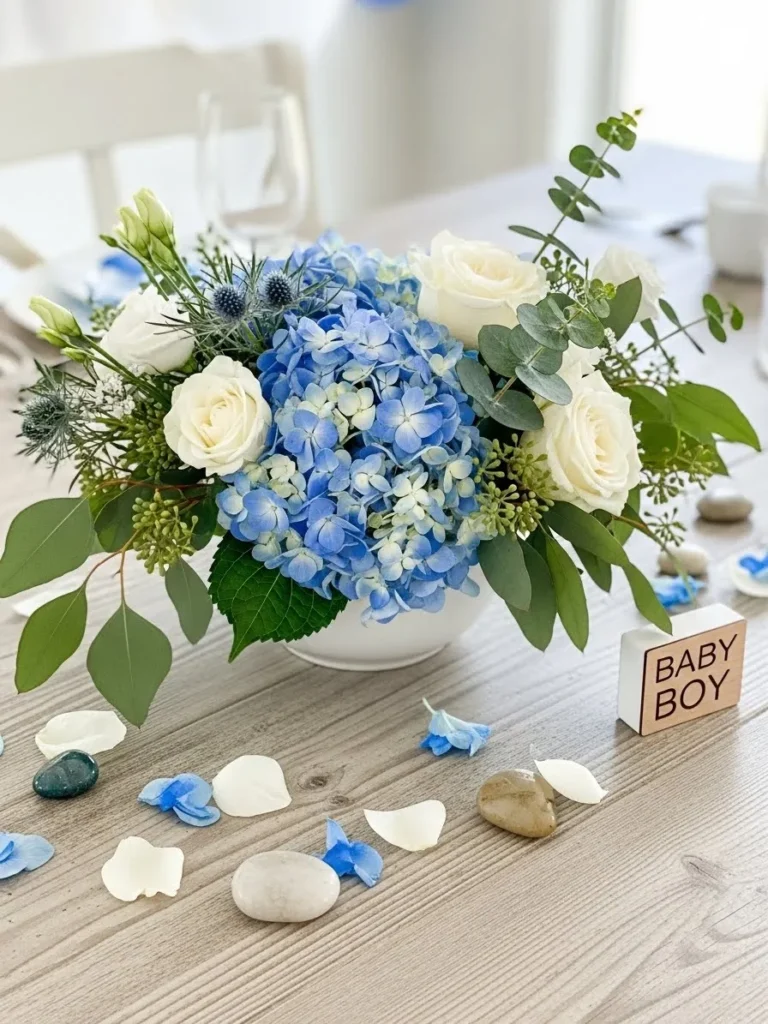 This table design leans into soft elegance with a fresh modern feel that works beautifully for a baby boy shower. The mix of blue hydrangeas and classic white roses feels clean and timeless while the eucalyptus and greenery add that airy organic touch everyone loves right now. The white bowl keeps the arrangement grounded and simple, letting the colors stand out without overpowering the table. Little details like scattered petals and natural stones give it a relaxed styled look that still feels very intentional.