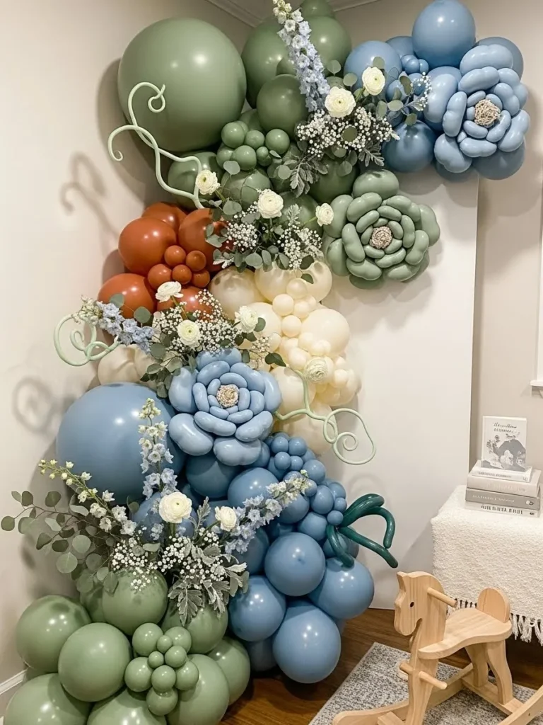 This setup feels like a modern garden moment brought indoors and I love how sculptural it looks. Oversized balloon florals in soft blue, sage green, creamy ivory, and warm clay tones are layered together to create a full statement wall without feeling busy. The balloons are styled to mimic blooming flowers with rounded petals and subtle centers, while fresh looking greenery and delicate white florals are tucked throughout to soften everything up. The mix of matte balloon finishes and organic shapes gives it that fresh Baby in Bloom vibe with a clean modern twist that feels right at home in a stylish living space.