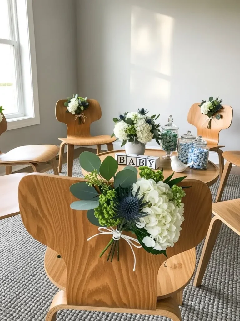 This setup leans into clean lines and warm natural textures with those beautiful bentwood chairs arranged in a relaxed circle that instantly feels welcoming. Each chair is dressed up with small floral bundles in soft whites greens and muted blue tones which adds just the right touch of baby in bloom charm without feeling overdone. The neutral walls and simple flooring keep everything airy and calm while the wooden accents bring in that cozy modern vibe that works so well for an intimate baby shower gathering. Even the candy jars and little baby blocks on the table feel thoughtfully placed rather than styled to death.