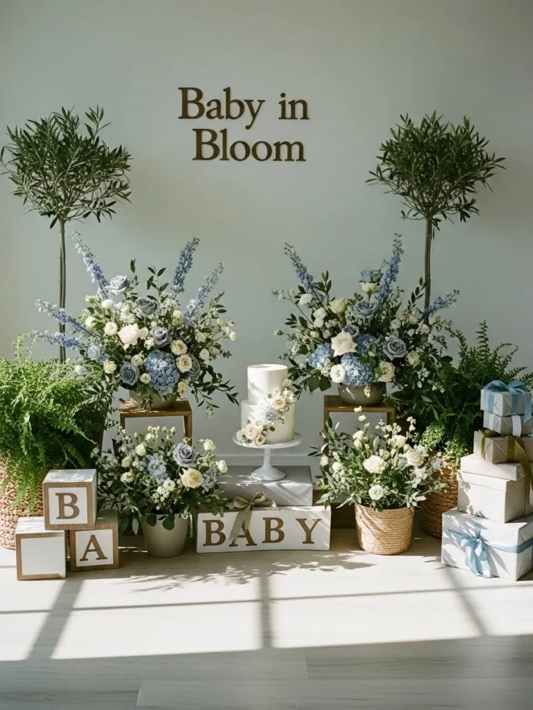 I honestly think this design is stunning because it feels grown up and joyful at the same time. The blue is calm and modern, the flowers feel fresh and natural, and nothing feels overdone. If you want a baby in bloom theme that still feels stylish and current, this is exactly the kind of look I would copy. It feels welcoming, elegant, and easy on the eyes, which is always a win when guests are sitting around chatting, snacking, and soaking in the celebration.