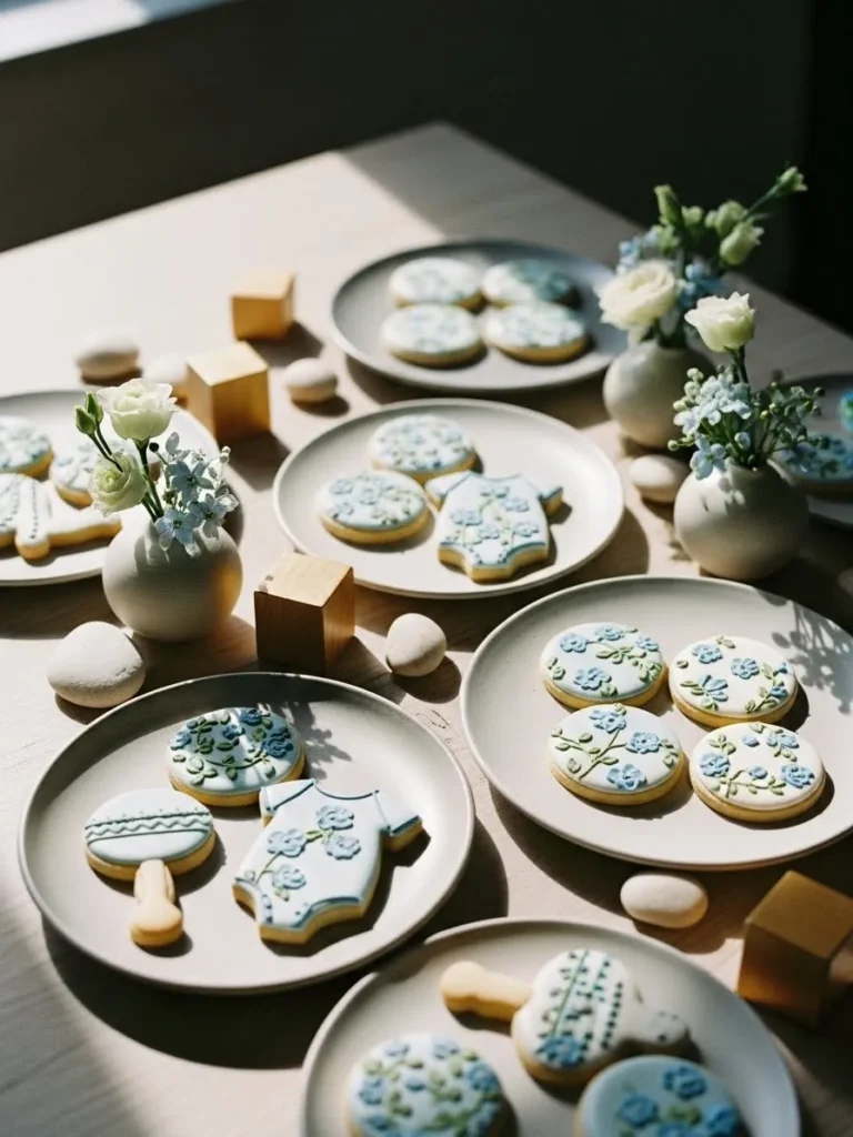 This setup feels like a breath of fresh air with its soft blue icing details, clean ceramic plates, and simple floral accents tucked into rounded vases. The color palette leans gentle and modern with pale blues, creamy whites, and light wood elements that keep everything feeling calm and uncluttered. The cookies themselves double as decor with delicate floral patterns and baby themed shapes that fit perfectly into a Baby in Bloom concept without feeling overly sweet or busy. Natural light washes over the table and highlights the textures, making the whole arrangement feel intentional yet relaxed.