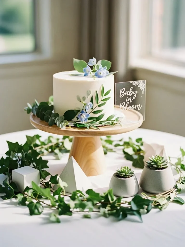 This setup feels fresh and calm with a clean white cake as the star, gently dressed up with soft blue florals and leafy greenery. The wooden cake stand adds warmth and keeps the look grounded while the surrounding decor stays simple and modern. I love how the small concrete planters and geometric accents bring in a contemporary edge without feeling cold or stark. Everything feels airy and intentional, like it belongs in a sunlit dining room rather than a formal event space.