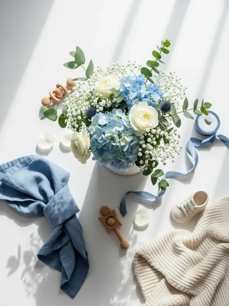 This setup feels fresh and modern while still being sweet and baby ready. Soft blue hydrangeas sit at the center, mixed with creamy white blooms and airy greenery that instantly lighten the whole space. The white tabletop keeps everything crisp, while subtle baby blue accents like ribbon and fabric add a gentle pop of color without feeling themed or overdone. Natural textures like wood toys and cozy knits give it that relaxed lived in feel that works beautifully for a modern baby in bloom shower.