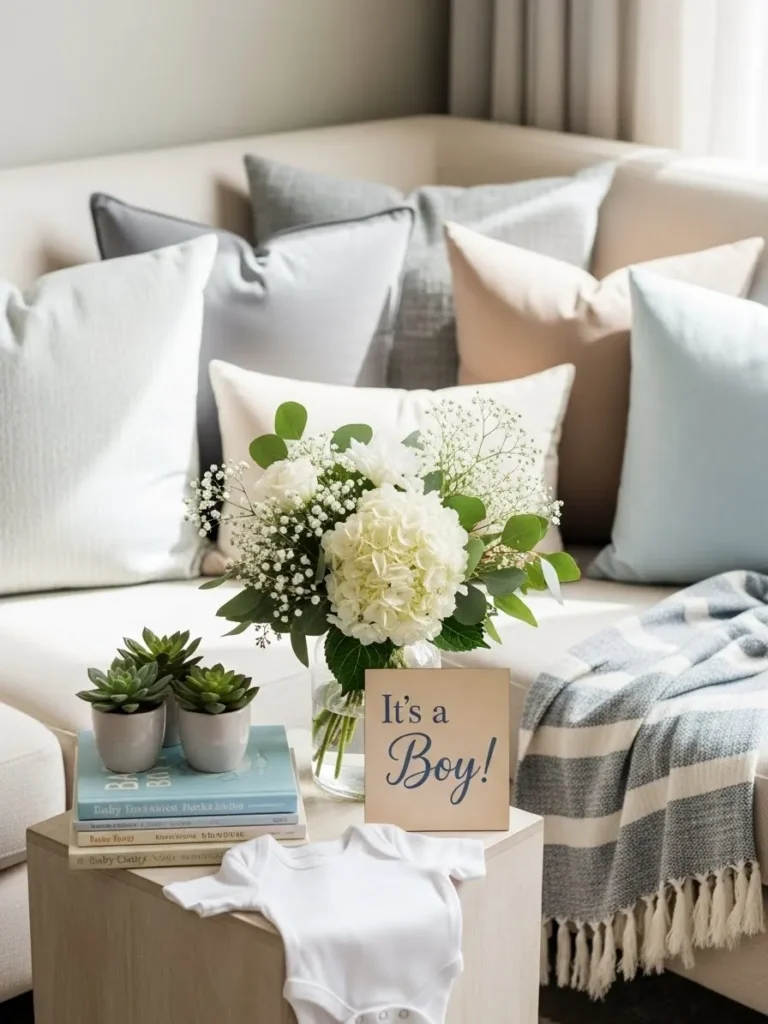 This setup feels calm and airy with a creamy sofa layered in soft white beige and pale blue pillows that instantly set a relaxed mood. A simple coffee table holds a delicate white floral arrangement mixed with greenery which brings that baby in bloom feeling without looking fussy. The little details really shine here like the cozy throw blanket folded casually and the subtle decor pieces that keep everything looking clean and modern. It feels like a real living space that just happens to be baby shower ready which I always love.
