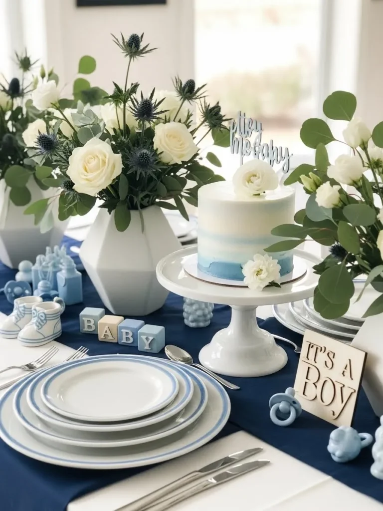 This setup feels fresh and modern while still keeping that sweet baby in bloom charm. The table is styled with crisp white florals mixed with soft greenery, all grounded by calming blue tones that feel perfect for a boy baby shower. I love how the ombre cake adds a gentle pop of color without overpowering the table, and the clean white stands and vases keep everything looking polished and airy. Little details like the baby blocks, tiny booties, and simple place settings make it feel thoughtfully styled but not fussy at all. It is the kind of table that looks beautiful from every angle and photographs like a dream.