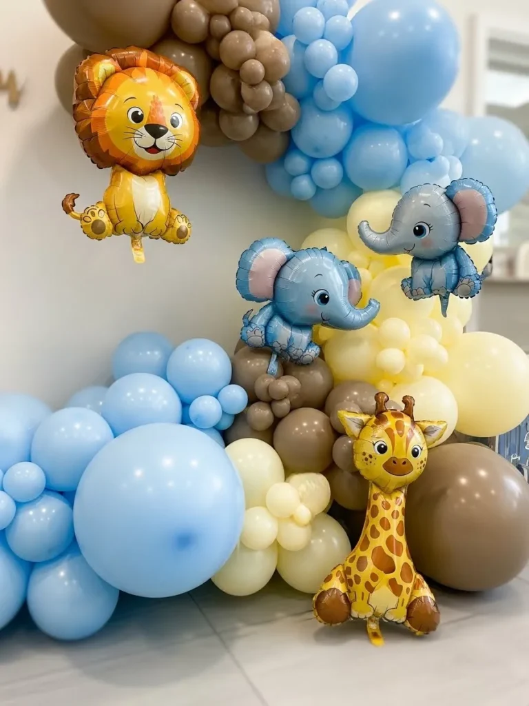 This safari themed setup features an oversized balloon arrangement in soft baby blue, warm brown, and creamy yellow tones, styled to feel playful but still polished. Cute animal balloons like elephants, a giraffe, and a sweet little lion are tucked into the design, giving it that storybook safari vibe without feeling too busy. The mix of balloon sizes adds depth and movement, while the gentle color palette keeps everything looking calm and cohesive. It feels light, airy, and perfectly suited for an indoor baby shower where you want something eye catching but not overwhelming.