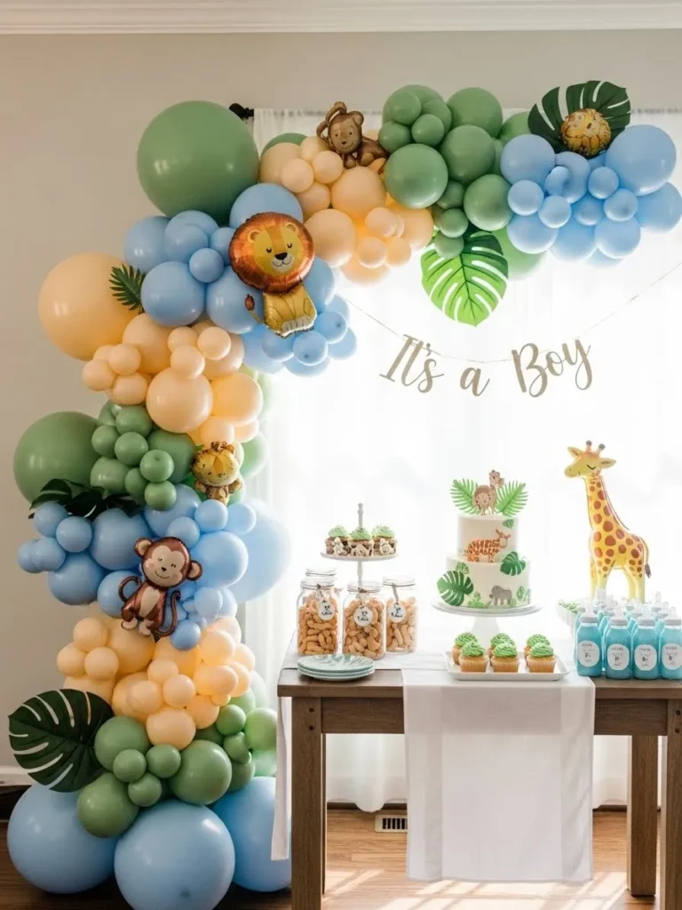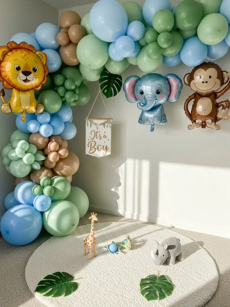 This safari baby shower setup feels soft, cheerful, and perfectly styled for a little boy celebration. The oversized balloon arch blends gentle greens, soft blues, and warm neutral tones to create a calm jungle inspired backdrop without feeling too loud. Cute animal balloons like the lion, elephant, and monkey add personality while still keeping everything sweet and baby friendly. The simple wall, cozy rug, and scattered safari toys make the space feel like a playful nursery corner rather than a formal party setup, which is honestly such a win for photos and guest flow.