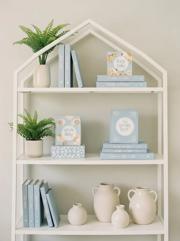 This shelf setup feels calm and charming with its soft safari vibe and nursery ready look. The white house shaped shelving creates a cozy frame while pale blue books and keepsakes keep everything light and gentle. Little safari themed books sit neatly stacked and styled facing forward like tiny decor moments instead of clutter. Soft greenery adds just the right touch of life without overpowering the shelf. The neutral ceramic vases ground the look and give it that polished home decor feel that works beautifully for a baby shower setting.