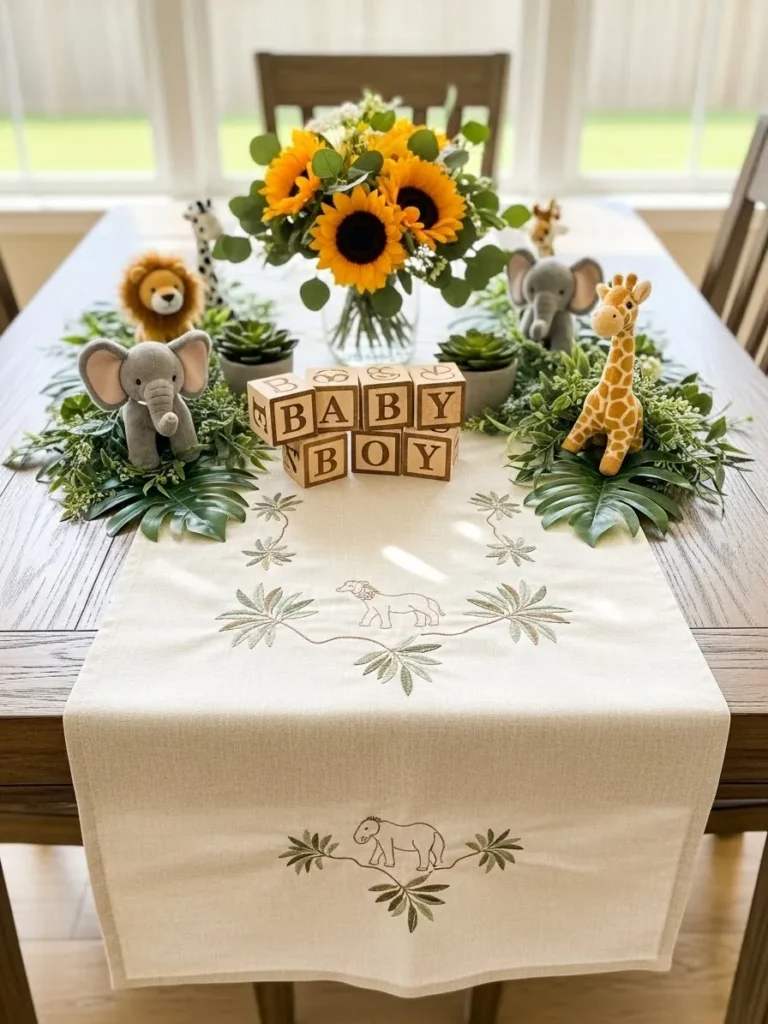 This safari baby shower table setup feels calm playful and thoughtfully styled without going over the top. The soft neutral table runner features delicate safari animal illustrations that instantly set the theme while still feeling light and home friendly. Plush animal figures like the elephant giraffe and lion are placed evenly along the center which gives the table a balanced look without feeling crowded. The wooden baby boy blocks add a charming focal point and the sunflower arrangement brings in a happy pop of color that warms everything up. Greenery layered underneath ties the whole safari vibe together in a way that feels natural and cozy rather than themed to the extreme.
