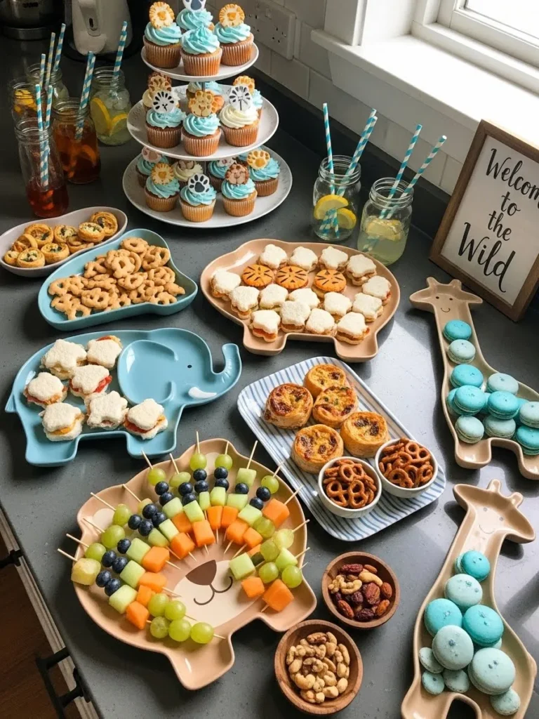 This safari snack table feels bright cheerful and perfectly styled for a baby shower that wants to be fun without looking overdone. The setup mixes soft blue and sandy beige tones with adorable animal shaped plates that instantly give it that safari vibe. From cupcakes topped with animal cookies to fruit skewers arranged like little jungle treats everything feels thoughtfully placed but still relaxed. The mix of sweet and savory snacks makes it practical too while the mason jar drinks with striped straws add that extra Pinterest worthy touch.