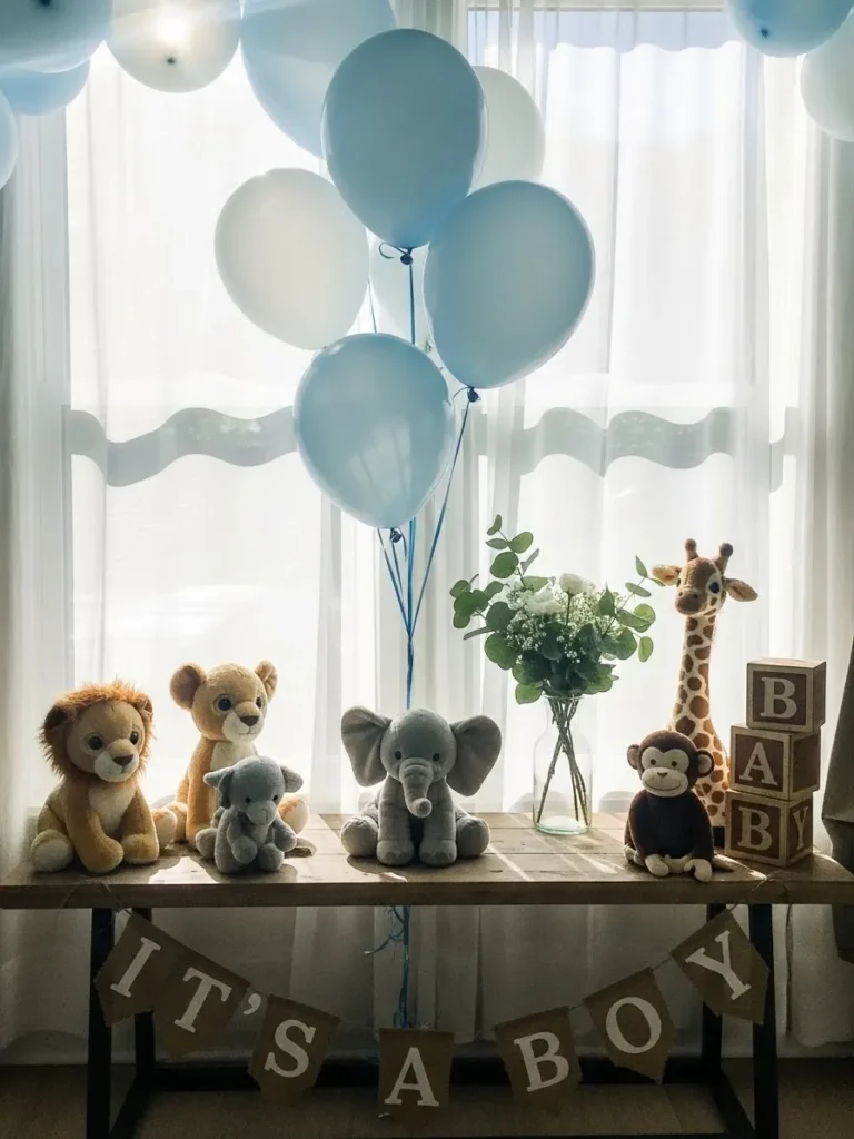 This sweet safari setup features a simple wooden shelf styled with plush safari animals in soft neutral tones, paired with airy light blue and white balloons floating above. The backdrop of sheer curtains lets natural light pour in, which keeps everything feeling calm and cozy rather than overly themed. Little details like the wooden baby blocks, a gentle greenery arrangement, and the muted color palette make the whole display feel thoughtfully styled and very Pinterest friendly. It feels more like beautiful home decor than party decor, which is exactly why it works so well for a baby shower.