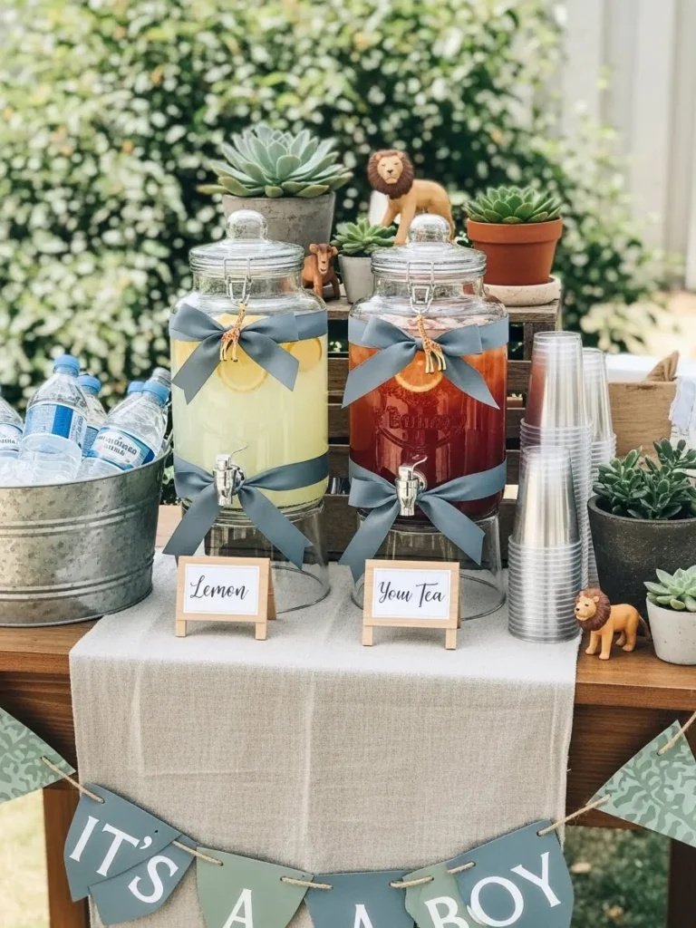This safari themed drink station feels relaxed playful and perfectly styled for an outdoor baby shower. The wooden table keeps things grounded and natural while the neutral linen runner softens the look and adds that cozy hosted at home vibe. Glass drink dispensers with simple ribbon bows sit front and center offering refreshing lemonade and iced tea which feels both practical and pretty. Little safari animal figurines tucked among succulents add charm without feeling cluttered and the muted greens and soft blues keep everything calm and cohesive. Even the simple chalk style labels and stacked clear cups feel thoughtfully placed and easy for guests to use.
