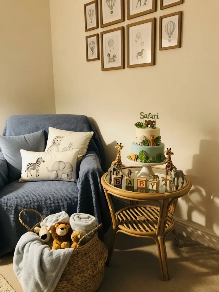This setup feels like a sweet little safari nook you could happily sit in all afternoon. A soft blue armchair anchors the space and instantly makes it feel calm and welcoming. The animal print pillows add gentle safari charm without going over the top. A woven rattan side table holds a playful tiered cake decorated with jungle animals and leafy details that feel fun but still polished. I love how the wooden BABY blocks and small animal figurines create layers of interest at table height. The framed hot air balloon and safari art above pulls the whole scene together and gives it that nursery inspired storybook feel.