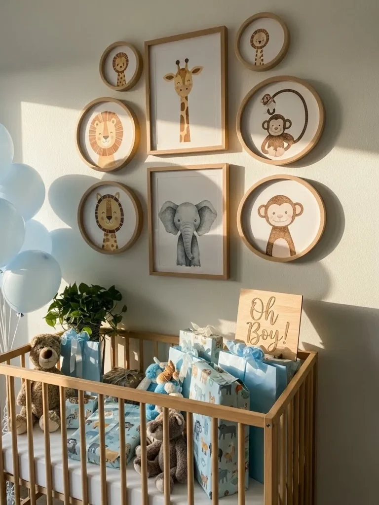 This sweet safari setup mixes playful animal artwork with a calm neutral backdrop that feels perfect for a baby boy celebration. The wall gallery features soft watercolor style giraffes elephants lions and monkeys framed in warm wood tones that instantly cozy up the space. Everything feels balanced and intentional without being too matchy. The wooden crib doubles as a display zone filled with neatly wrapped gifts in pale blue papers plush toys and simple greenery. Natural light spills across the wall and really brings out the gentle colors which makes the whole corner feel bright happy and welcoming.