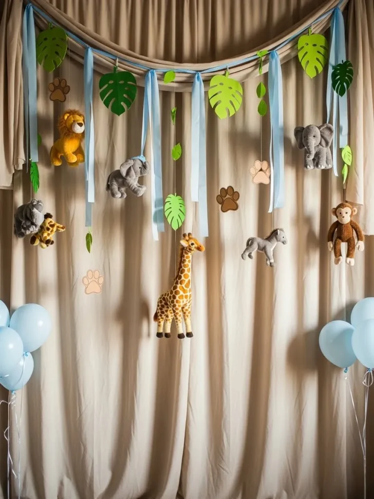 This safari themed backdrop features soft neutral curtains dressed up with hanging plush animals like giraffes elephants lions and monkeys. Light blue ribbons cascade down between leafy jungle cutouts which adds movement without feeling busy. The mix of felt leaves paw prints and cuddly textures keeps everything playful while still looking polished. Soft blue balloons on each side frame the setup nicely and help balance out the warm beige background so the whole scene feels calm cheerful and photo ready.