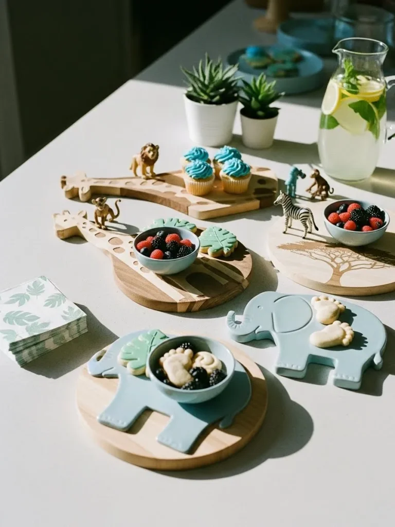 This safari baby shower setup feels fresh fun and totally pulled together without trying too hard. The table is styled with soft wood serving boards shaped like animals paired with muted green and blue accents that keep everything calm and coordinated. Little safari figures pop up here and there which adds personality without feeling cluttered. I love how the snacks are kept simple but thoughtful with berries cookies and cupcakes all styled on low trays so everything feels approachable and easy to grab. The natural light and clean white surface really let the colors and textures shine which makes the whole setup feel bright and welcoming.