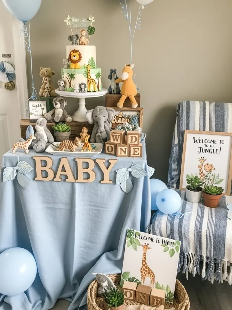 This safari baby shower setup feels warm and playful with its soft blue linens gentle wood accents and the sweetest collection of jungle animals. Plush elephants giraffes and lions are layered at different heights to create a cozy styled look that feels thoughtful but not fussy. The cake takes center stage with soft greens and adorable animal details while wooden blocks greenery and framed jungle prints add that homey Pinterest worthy touch. Everything feels balanced and calm with muted blues sandy neutrals and just enough greenery to keep it fresh and light.