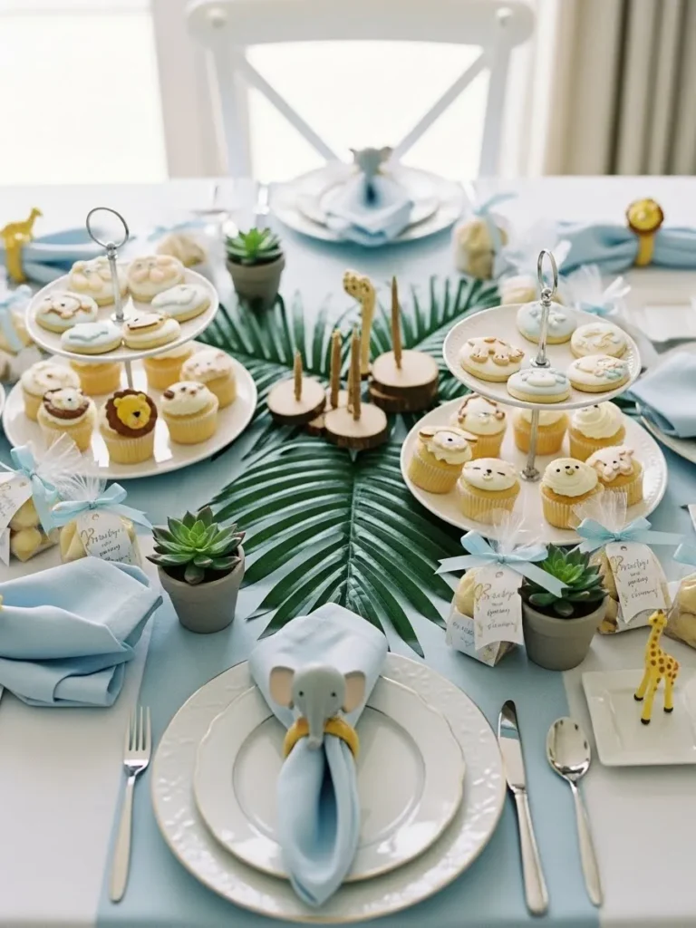 This safari baby shower setup feels light airy and oh so charming with its soft blue table linens crisp white plates and the cutest animal themed treats. Tiered dessert stands are filled with frosted cupcakes and cookies decorated with gentle safari faces while palm leaves add that playful jungle touch without feeling over the top. Little succulents and mini animal figurines are scattered across the table which makes everything feel thoughtful and styled but still relaxed. The napkin folds with tiny elephant details are such a sweet surprise and really pull the whole table together in a polished yet friendly way.