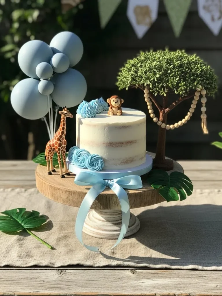 This safari inspired cake table feels playful and polished at the same time, which is honestly my favorite combo for a baby shower. The soft blue and neutral color palette keeps everything calm and cohesive, while the little safari animals bring in that fun jungle vibe without feeling over the top. I love how the wooden cake stand adds warmth and texture, paired with the simple frosted cake and delicate blue ribbon. The balloon cluster in muted blue tones keeps the look light and airy, and the tree detail with bead garland adds just enough whimsy to make it feel styled but not staged.