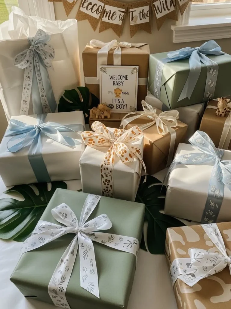This safari themed gift table feels calm and thoughtfully styled with a soft neutral palette and gentle wild details that never overwhelm the space. Wrapped presents in sage green, warm beige, creamy white, and muted blue are layered together with leafy accents that give everything a fresh jungle inspired feel. The ribbons are simple but charming with subtle patterns that hint at safari animals without being too literal. Everything is arranged neatly on a clean surface near natural light which makes the colors look extra warm and welcoming. It feels curated but still relaxed which is exactly what you want for a baby shower setup.