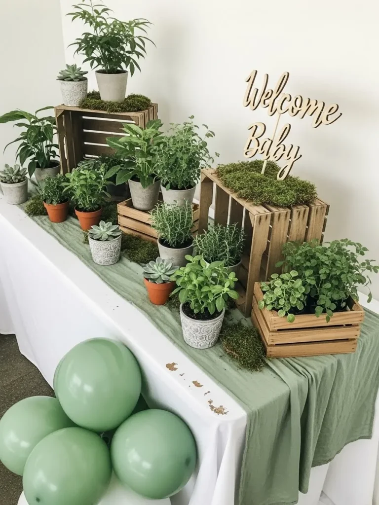 This setup feels like a mini indoor garden brought straight into the baby shower. Wooden crates are stacked at different heights to create a layered look, each one filled with lush green plants in soft neutral pots. Moss accents add texture and that earthy touch everyone loves right now. The muted sage table runner ties everything together beautifully while soft green balloons tucked underneath keep it playful and baby friendly. The simple Welcome Baby sign nestled among the greenery makes the whole table feel intentional without being overdone.