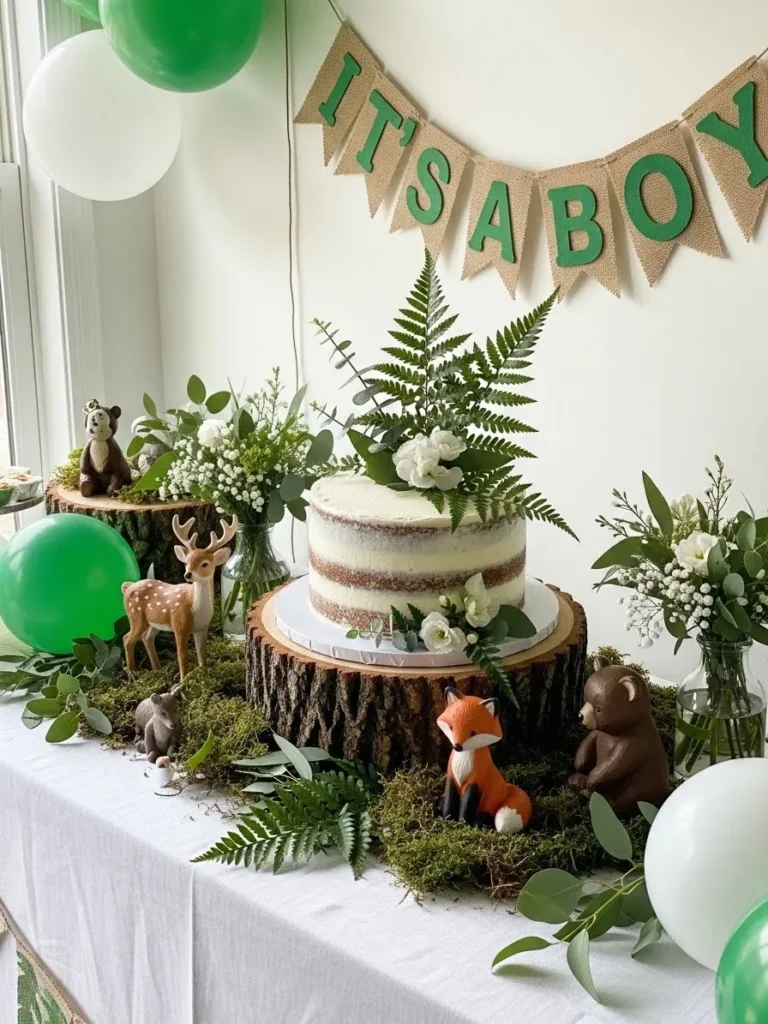This setup feels like a tiny forest moment brought indoors, with soft greens layered through balloons, foliage, and sweet little woodland details. The cake sits proudly on a rustic wood slice base, surrounded by mossy textures, leafy stems, and neutral florals that keep everything calm and natural. I love how the animal accents add personality without tipping into theme overload, and the burlap banner brings in that cozy handmade feel that works so well for a boy baby shower.