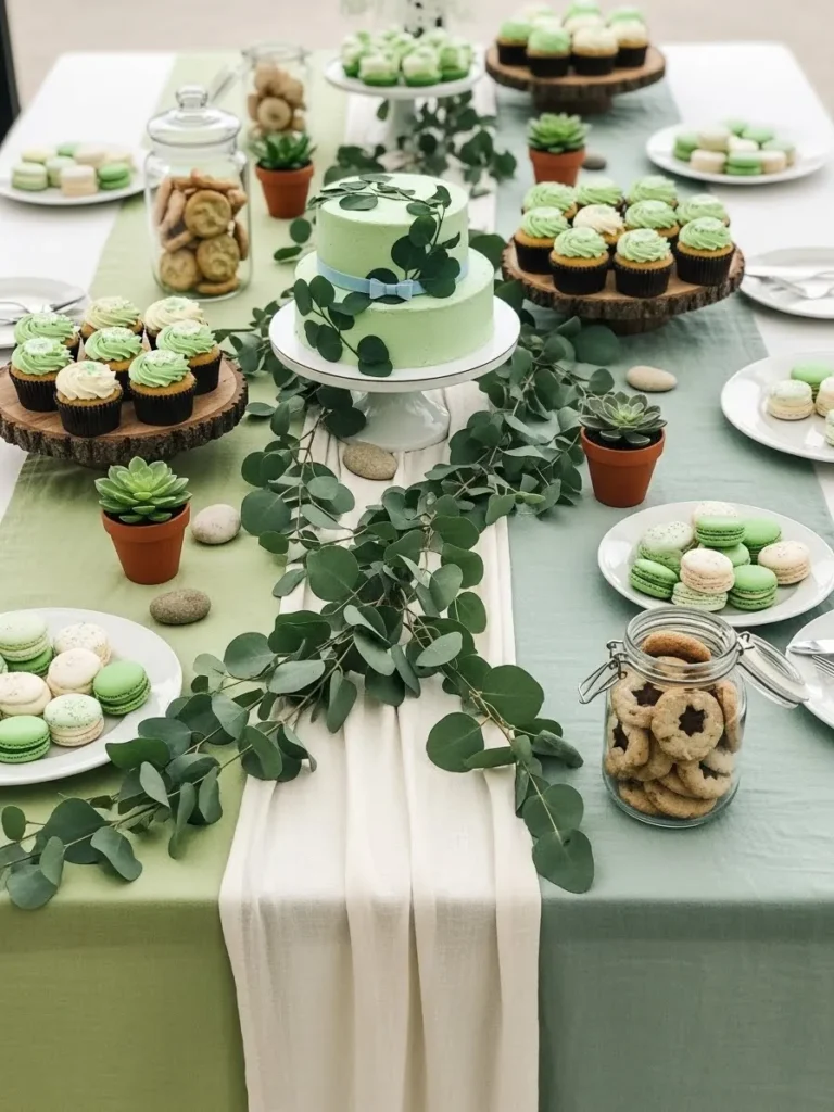 This setup feels like a little garden party brought indoors and I am so here for it. The soft green table linens set a calm base, while layers of eucalyptus garlands run right down the center for that fresh natural look. A simple two tier cake in pale green sits as the focal point, surrounded by cupcakes with swirled green frosting, macarons in mixed sage and cream tones, and rustic cookies displayed in clear jars. Wooden cake stands, white plates, and tiny potted succulents keep everything grounded and earthy without feeling overly styled or fussy.