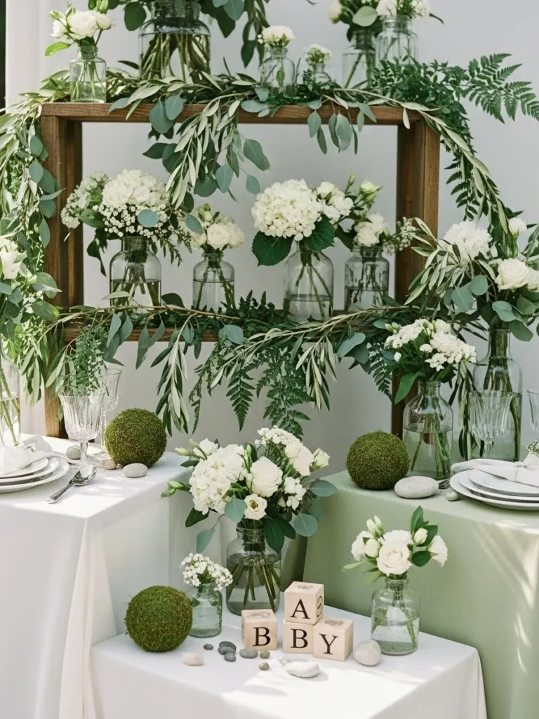 This setup feels like a soft little garden moment brought indoors, and I love how effortlessly calm it looks. The wooden shelving creates height and structure while being completely softened by cascading eucalyptus, olive branches, and leafy greens that spill over every edge in the prettiest way. Clear glass vases filled with white florals keep everything light and airy, while the mix of moss balls, smooth stones, and simple table linens adds that grounded natural feel. The pale green and white color palette works beautifully for a baby boy shower without feeling themed or overdone, and those subtle baby blocks tucked in at the bottom are just the right touch of sweetness.
