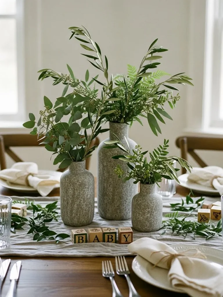 I love this kind of centerpiece because it feels so peaceful and effortless, like something you could actually recreate at home without stressing. It gives that fresh green baby shower look while still feeling grown up and cozy, which is always my favorite combo. It also photographs beautifully from every angle, and honestly, I would happily keep these vases on my dining table long after the party is over.