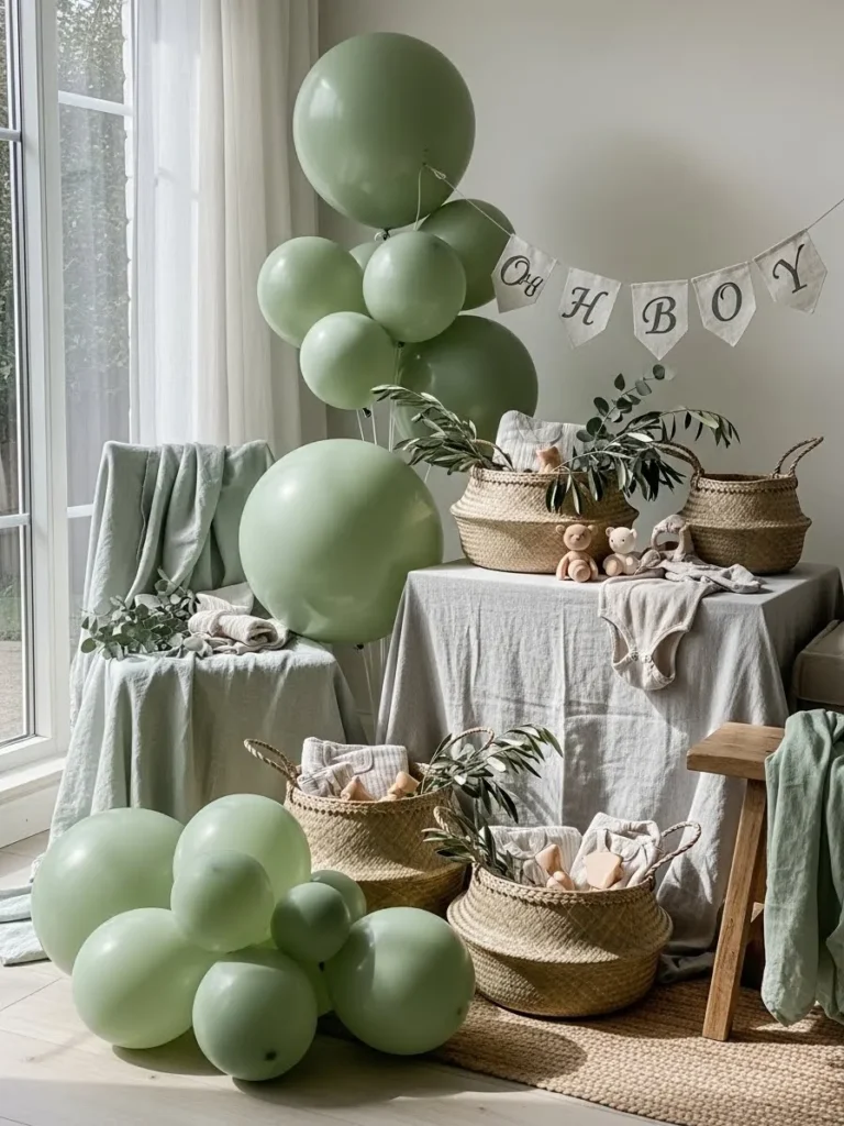 This setup leans into soft sage greens and natural textures in the prettiest way. The muted green balloons feel airy and calm instead of loud, and I love how they are styled in loose clusters rather than a stiff arch. Woven baskets filled with tiny baby items add warmth and texture, while leafy branches bring that fresh outdoor feeling inside. Neutral linens and light wood accents keep everything feeling relaxed and organic, and the gentle daylight makes the whole space glow without trying too hard.