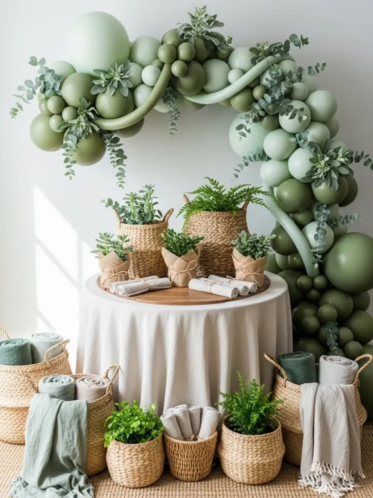This setup leans hard into that calm natural vibe with a soft green balloon arch that feels organic and airy instead of loud or overdone. The mix of sage olive and pale eucalyptus tones keeps everything soothing and balanced. I love how the balloons are layered in different sizes and tucked with faux greenery so it almost looks like a living installation. The woven baskets filled with plants and rolled linens add texture and warmth while the simple round table anchors the whole look and keeps it grounded and inviting.