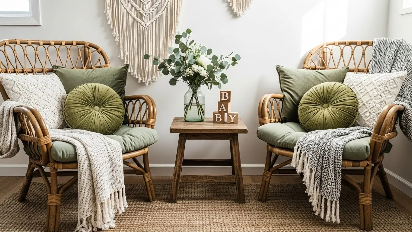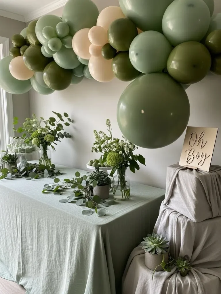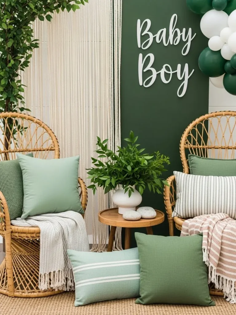 I honestly love how calm and fresh this looks. It feels cozy without trying too hard and that is my favorite kind of decor. The mix of greens feels soothing and welcoming which is perfect for celebrating a baby boy. If you want something that feels stylish but still relaxed and natural this kind of setup totally hits the sweet spot for me.