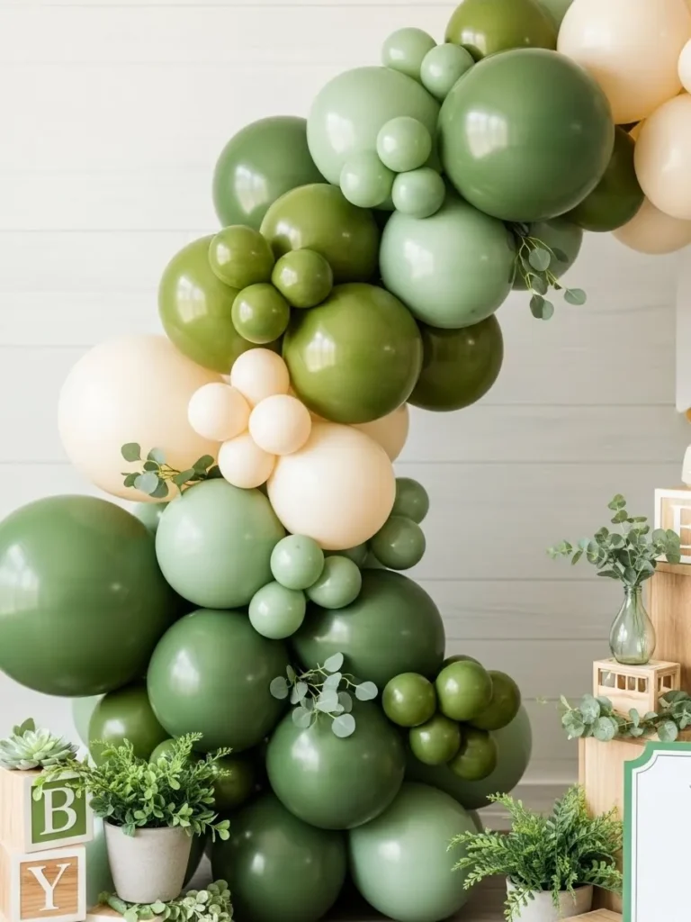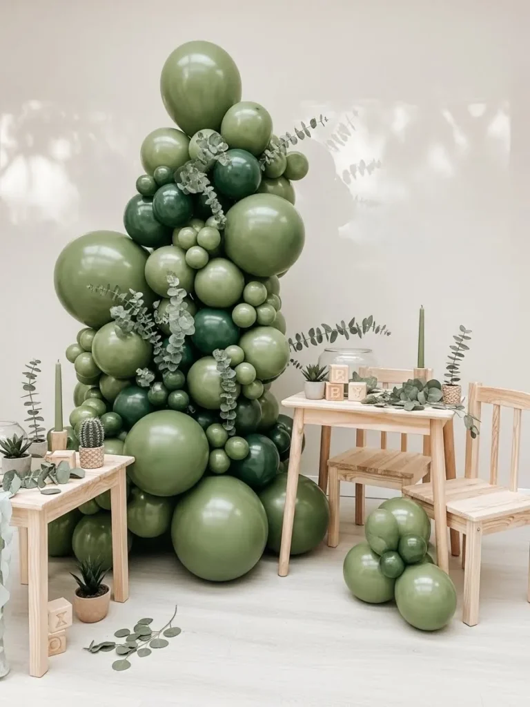 This setup features a lush cluster of green balloons in soft sage olive and deeper forest tones arranged into a tall sculptural corner. The balloons vary in size which gives the whole look a natural layered feel instead of something stiff or overly styled. Light wooden tables and chairs keep the space grounded and warm while small potted plants eucalyptus sprigs and simple baby blocks add that sweet baby shower charm without going over the top. The neutral wall and pale flooring let all those gorgeous greens really shine and keep the space feeling airy and calm.