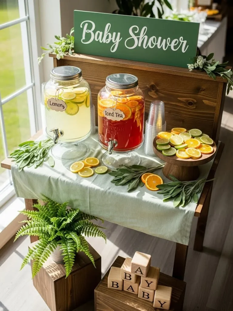 This baby shower setup leans into soft green tones and natural textures in the sweetest way. A simple wooden stand becomes the star with glass drink dispensers filled with lemon water and iced tea layered with citrus slices. Greenery is tucked in casually with leafy stems and a potted fern adding that just brought in from the garden feeling. The muted green sign paired with linen fabric keeps everything calm and cohesive while wooden blocks and crates ground the look with a warm earthy touch.