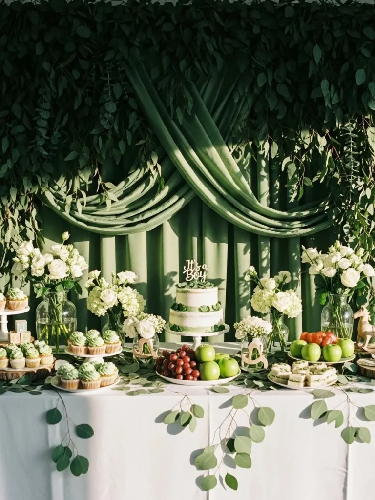 I honestly love how relaxed and effortless this table feels while still looking totally Pinterest worthy. It reminds me of the kind of setup that feels welcoming the second you walk into the room. I would absolutely recreate something like this because it proves you do not need bold colors or over the top decorations to make a statement. The mix of greenery, soft greens, and simple desserts just works and it feels perfect for a baby boy shower with a calm natural vibe.