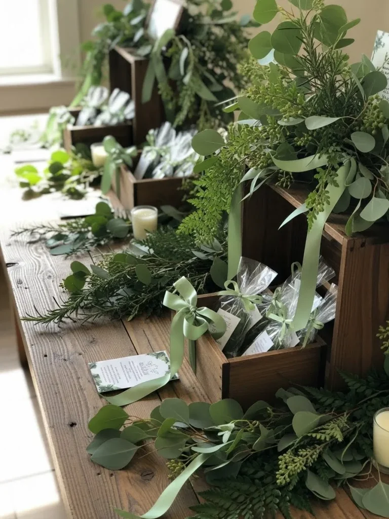 This setup features a long wooden table layered with rustic crate boxes filled with greenery and baby shower favors. Soft eucalyptus leaves and fern sprigs spill gently across the surface and give everything that fresh just picked look. Simple candles add a cozy glow while green ribbon ties the favors together for a calm and earthy finish. The mix of raw wood and lush botanicals feels relaxed and intentional without trying too hard.