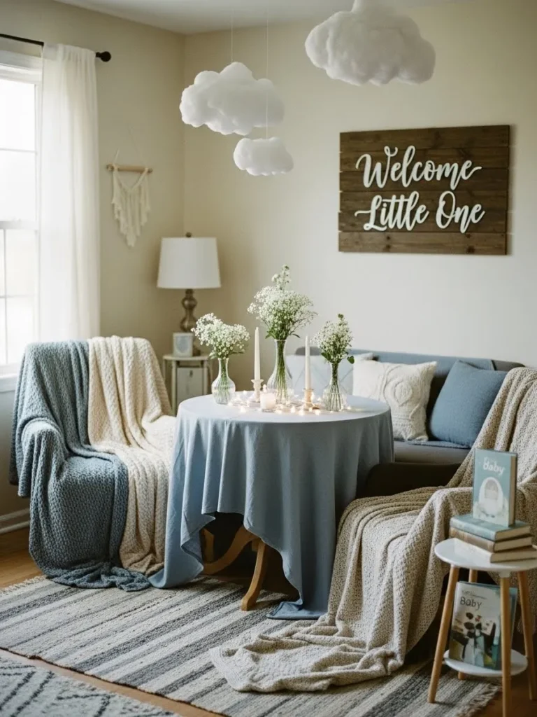 This room is all about soft blues and cozy layers that instantly make the space feel calm and welcoming. A round table dressed in a dusty blue tablecloth sits at the center with simple florals and candles that add just enough charm without feeling fussy. The seating area feels extra inviting thanks to textured throws draped over chairs and the sofa, while fluffy cloud decorations hanging from the ceiling give the whole room a sweet dreamy vibe. The neutral walls and natural light keep everything feeling airy, and that rustic welcome sign adds the perfect personal touch without overpowering the space.