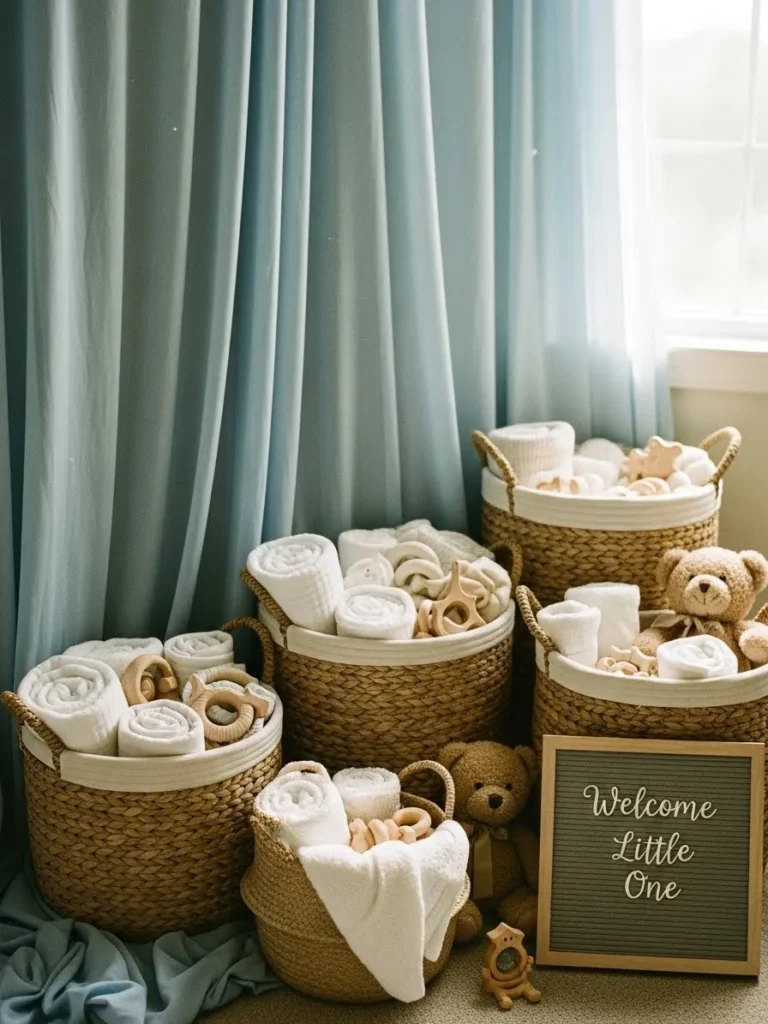 This cozy little setup feels like a gentle hug the moment you look at it. Soft blue curtains filter in natural light while woven baskets line the floor, each one filled with rolled white towels, wooden toys, and sweet baby essentials. The neutral textures from the baskets pair beautifully with the calm fabric tones, and those tiny teddy bears tucked in between add just the right amount of heart melting charm. It looks styled but not stiff, practical but still totally Pinterest worthy, which is honestly the dream for a baby shower space.