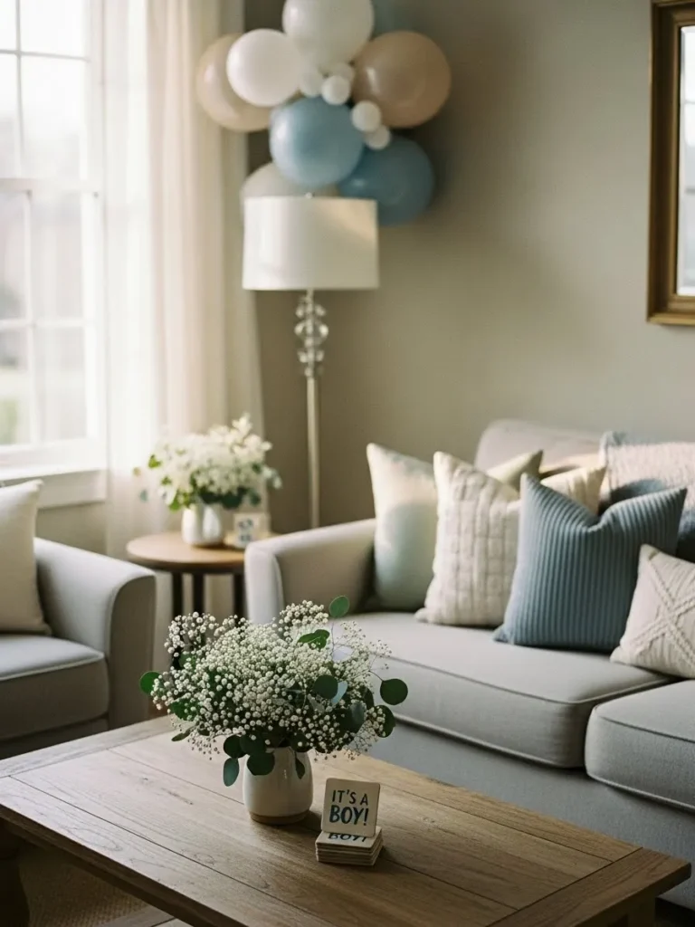 This living room baby shower setup feels calm, cozy, and effortlessly put together. The soft blue and warm neutral balloon cluster adds a sweet celebratory touch without overwhelming the space, while the light gray sofas and textured throw pillows keep everything feeling relaxed and welcoming. Natural light pours in through the window, bouncing off the muted wall color and making the room feel airy and serene. A simple wooden coffee table anchors the space with a delicate floral arrangement and a subtle baby announcement, proving that you really do not need over the top decor to set the mood.