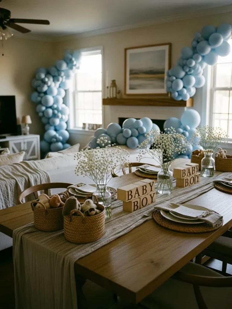 This cozy living room setup feels warm and welcoming while still looking totally Pinterest worthy. Soft blue balloon garlands frame the windows and fireplace in an organic flowing way that feels playful but not over the top. The neutral sofa and light wood furniture keep the room grounded and calm, while simple baby’s breath florals add an airy softness to the table. Natural textures like woven baskets, linen runners, and wooden baby blocks make everything feel relaxed and homey instead of staged. It’s the kind of space where guests naturally want to linger, chat, and snack without feeling like they’re in a formal party setup.