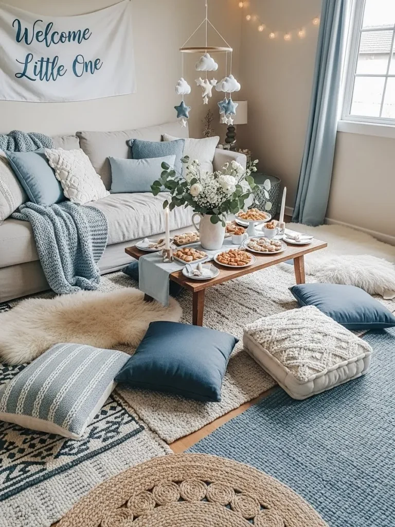 This cozy living room setup leans into soft blue and creamy neutrals to create a relaxed and welcoming baby shower vibe. The low wooden coffee table is styled with simple treats candles and fresh florals which keeps everything feeling intimate and unfussy. Plush floor cushions knitted poufs and layered rugs make the space feel extra inviting and encourage guests to sit back and get comfortable. Gentle string lights sheer curtains and sweet cloud and star decor add a soft playful touch that feels perfect for a baby boy celebration without going over the top.