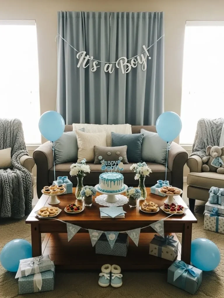 This baby shower living room feels warm and inviting with its gentle blue accents layered into a soft neutral space. The blue curtains create a calm backdrop while the simple Its a Boy banner keeps the look sweet and understated. Plush seating with cozy throws and pillows makes the room feel lived in and comfortable, not overly styled. The wooden coffee table is styled with a charming mix of flowers, treats, baby shoes, and a pastel blue cake that instantly becomes the focal point. Balloons and neatly wrapped gifts placed around the room add a festive touch while still letting the space breathe.