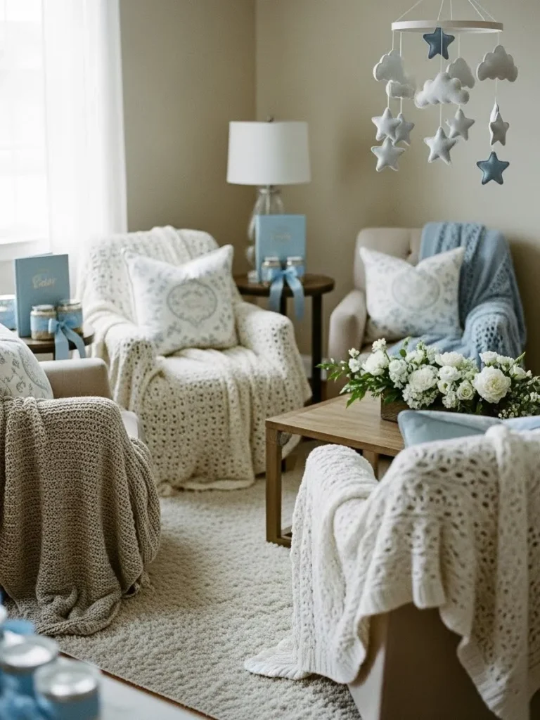This room is all about calm comfort and gentle baby shower charm. Soft neutral walls set a warm backdrop while plush armchairs are layered with chunky knit throws and delicate patterned pillows in pale blue and cream. A simple wooden coffee table anchors the space, topped with fresh white florals that add just the right touch of elegance. The star and cloud mobile floating above brings in a sweet nursery vibe without feeling overdone, and the soft textures everywhere make the whole room feel inviting and relaxed.