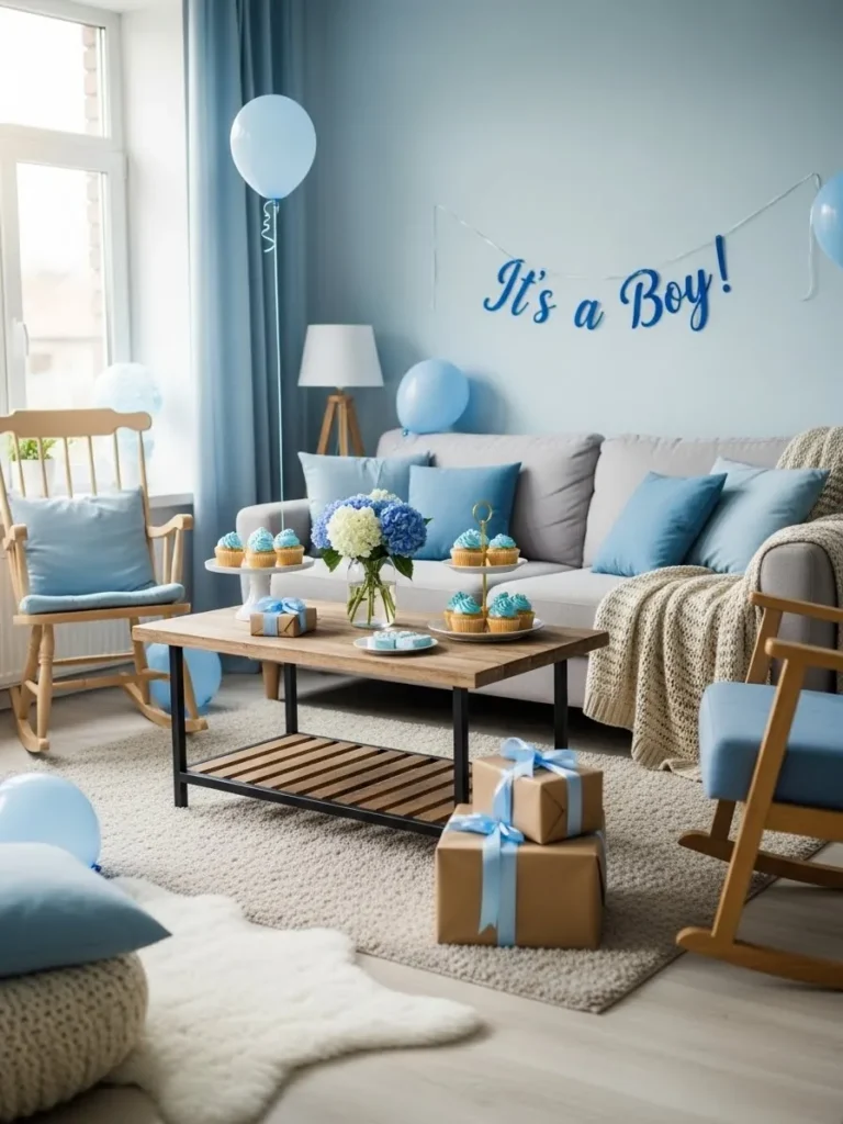 This cozy living room setup leans into soft blue tones that instantly feel calm and welcoming. The light blue walls set the mood, while the neutral sofa keeps everything grounded and comfy. Blue throw pillows, gentle balloon accents, and a simple It’s a Boy banner add just the right amount of celebration without overwhelming the space. The wooden coffee table styled with cupcakes and a small floral arrangement feels intimate and homey, and the rocking chairs bring in that sweet nursery inspired touch that works perfectly for a baby shower at home. Natural light from the window ties it all together and makes the whole room feel airy and relaxed.