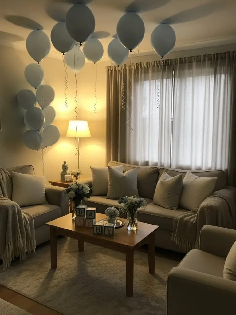 This cozy living room setup keeps things calm and welcoming with a soft neutral palette and gentle baby blue balloon accents floating across the ceiling. The plush beige sofas feel extra inviting with layered throw pillows and cozy blankets that make the space perfect for lounging. Warm lighting from the table lamp adds a golden glow while sheer curtains let in just enough natural light to keep the room bright but relaxed. Simple florals and classic baby blocks on the coffee table bring in sweet baby shower details without making the room feel cluttered or overdone.