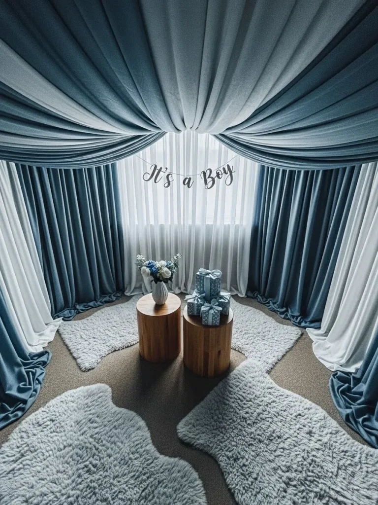 I absolutely love how this setup feels like a quiet little moment in the middle of the celebration. It feels soothing and intentional, almost like the room is giving everyone permission to slow down and enjoy the day. The soft blues feel comforting instead of loud, and the draping makes it feel extra special without needing balloons everywhere. If I were hosting a baby shower at home, this is exactly the kind of cozy corner I would want for photos, gift opening, and those sweet pauses where you just soak everything in.